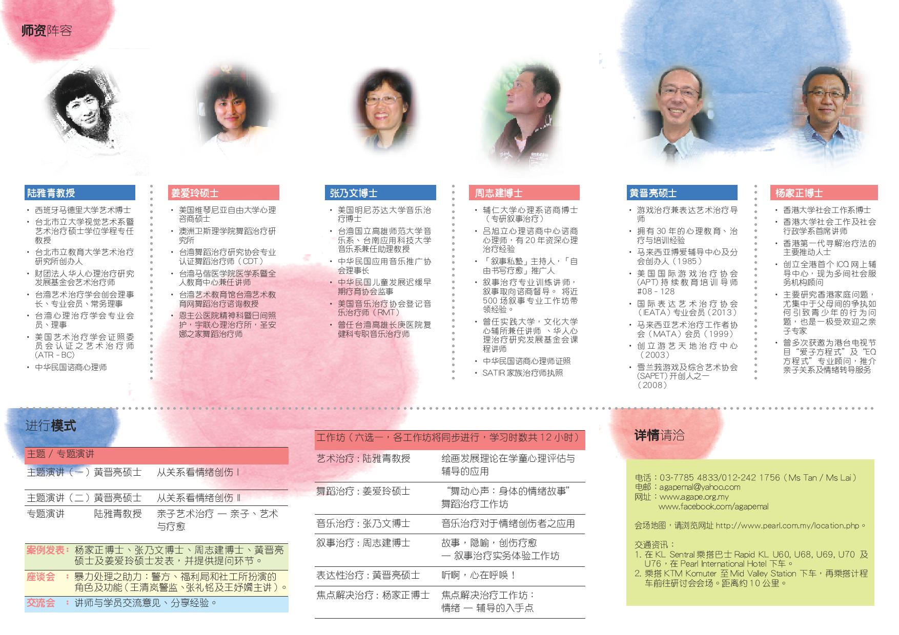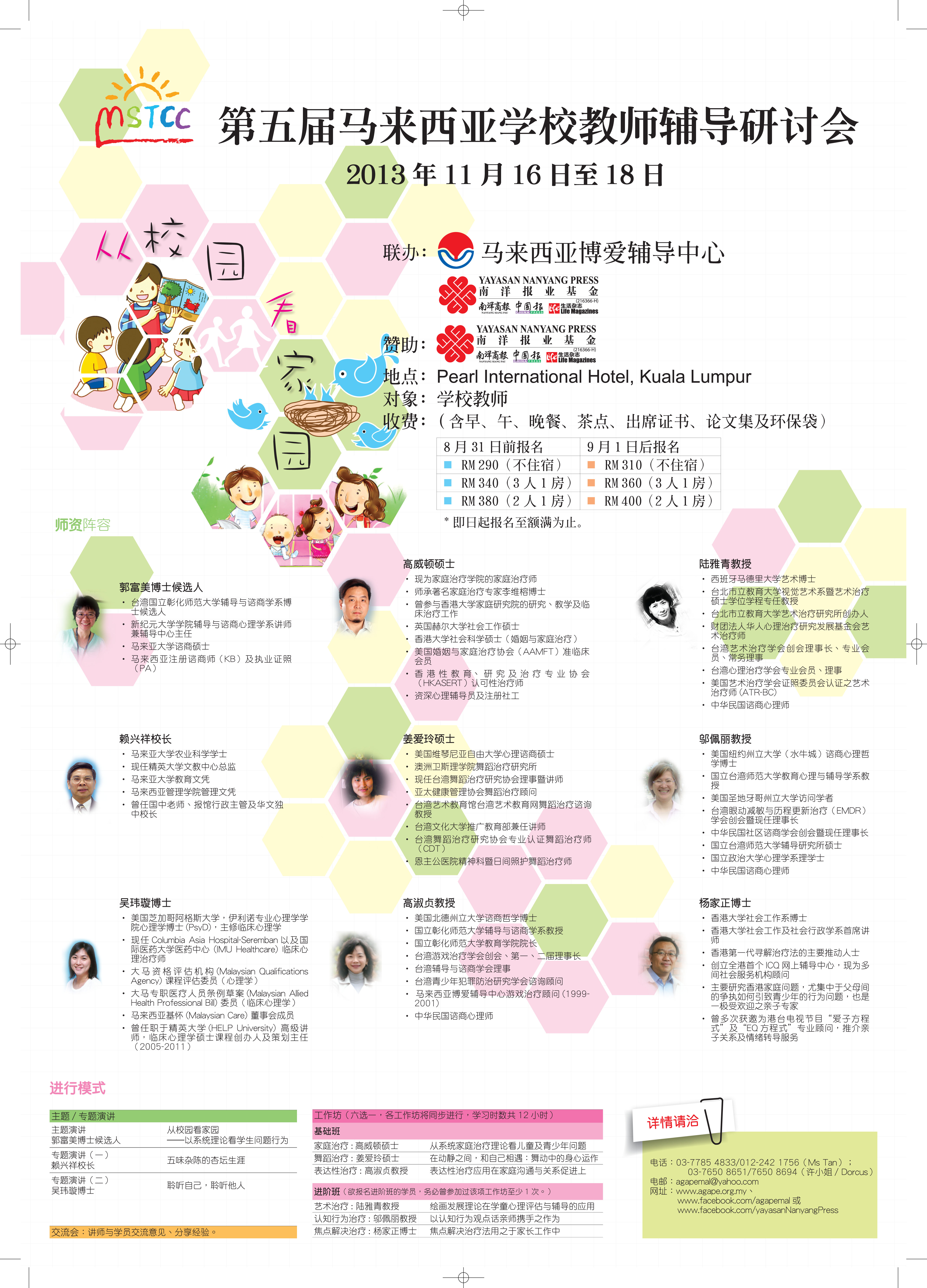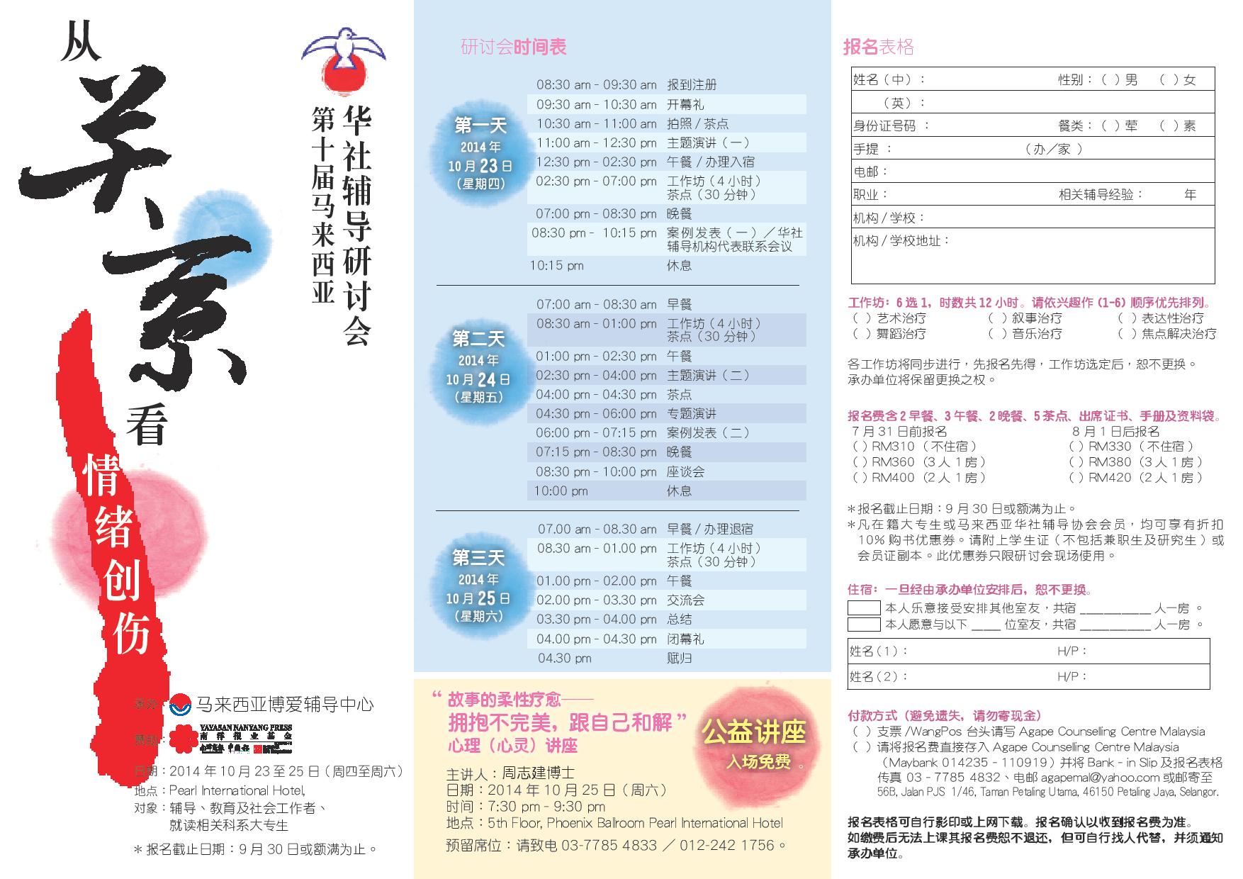 本届的大马教师辅导研讨会的主题是“校园危机:契机与转化“。研讨会的进行模式有主题及论文发表、五项工作坊: 艺术治疗, 舞蹈治疗,认知行为治疗, 表达性治疗和焦点解决治疗。艺术治疗的内容包括涂鸦、转化和成长;舞蹈治疗包括青春舞曲和身心整合;表达性治疗则是在教师心理健康照护的作用;认知行为治疗是学习校园的危机处理;最后一个是,怎么活用焦点解决治疗在校园的辅导中。每项工作坊的学习时间共12 小时,希望通过这个研讨会可以帮助更多学校教师,提升自己的辅导技巧。 最近报章上频频出现有关学生自杀的新闻, 引起许多人的关注和讨论。这些学生选择不归路的原因有如:考试成绩不理想、经不起失恋的挫败、家庭压力等等,孩子们的心灵很脆弱,所以面对难题的时候就不堪一击。因此,现在的教师也开始担起辅导的责任,尝试了解学生的问题,并以适当的治疗方法开导他们。然而,老师和学生的打架事件也逐日上升,这些暴力行为严重损坏学校的形象,也粉碎社会对校方的信任,重新评估现今的教学方案。这一届主题“校园危机:契机与转化“,宗旨就是希望教师可以学习到更有效的辅导方法,运用在自己和学生之间的关系上,把学校的危机转化成契机。所谓契机,能够造就奇迹。 这一次研讨会的讲师阵容非常强大,邀请到国内外著名的辅导专家,包括了中国湖北省武汉华中师范大学教育科学学院教育学的蔡苔芬博士,马来西亚国民大学辅导学的李志祥博士,西班牙马德里大学艺术博士的陆雅青教授,美国纽约州立大学谘商心理哲学博士的邬佩丽教授,台湾辅仁大学谘商心理学博士的李宗芹副教授,美国北德州立大学谘商哲学博士的高淑贞教授,香港大学社会工作博士的杨家正博士。 辅导是一门宝贵的学问, 所以南洋报业基金愿意捐助十万零吉给每一届辅导研讨会,而且今年的捐赠更增至到十五万零吉,成就更多教师学习的机会。博爱辅导中心和南洋报业基金,都希望通过这个研讨会可以让学员们受惠受益,把学到的知识发挥在学校里,提升一个健康的社会。 Events 活动7th Malaysia School Teachers Counselling Conference 第七届马来西亚学校教师辅导研讨会, 21-23 November 2015Links: Introduction 简介 | Workshop Schedule 研讨会时间表 | Speakers Introduction 讲师简介 | Registration 报名表格 The 1st Conference on Counselling for Malaysian Caregivers 《第一届马来西亚助人工作者辅导研讨会》, 30 May – 1 June 2015Links: Introduction 简介 | Teachers 老师 | Registration Form 报名表格 1 | Registration Form 报名表格 2 6th Malaysia School Teachers’ Counselling Conference 第六届马来西亚学校教师辅导研讨会, 22-24 November 2014Links: Introduction 简介 | Workshop Schedule 研讨会时间表 | Introduction of Speakers 讲师简介 10th Malaysia Chinese’ Counselling Conference 第十届马来西亚华社辅导研讨会, 23-25 October 2014Links: Introduction 简介 | Registration Form Page 1 报名表格 1 | Registration Form Page 2 报名表格 2 Basic Games Therapy Workshop 《游戏治疗初阶训练》工作坊, 7-8 December 2013Links: Introduction 简介 | Registration Form 报名表格 5th Conference on Counselling for School Teachers of Malaysia 第五届马来西亚学校教师辅导研讨会, 16-18 November 2013Links: Introduction 简介 | Teachers | Poster | Registration Form page 1 | Registration Form page 2 A Talk on Autism: Understanding Autism and Its Treatment 自闭症醒觉讲座会: 了解自闭症及其治疗方式, 14 April 2013Links: Introduction | Registration Form | Poster | News 新闻 #1 | News 新闻 #2 第四届马来西亚学校教师辅导研讨会 – 4th Conference on Counselling for School Teachers of Malaysia, 10-12 November 2012Links: News | Newspaper Cutting | Brochure 1 | Brochure 2 | Registration Form