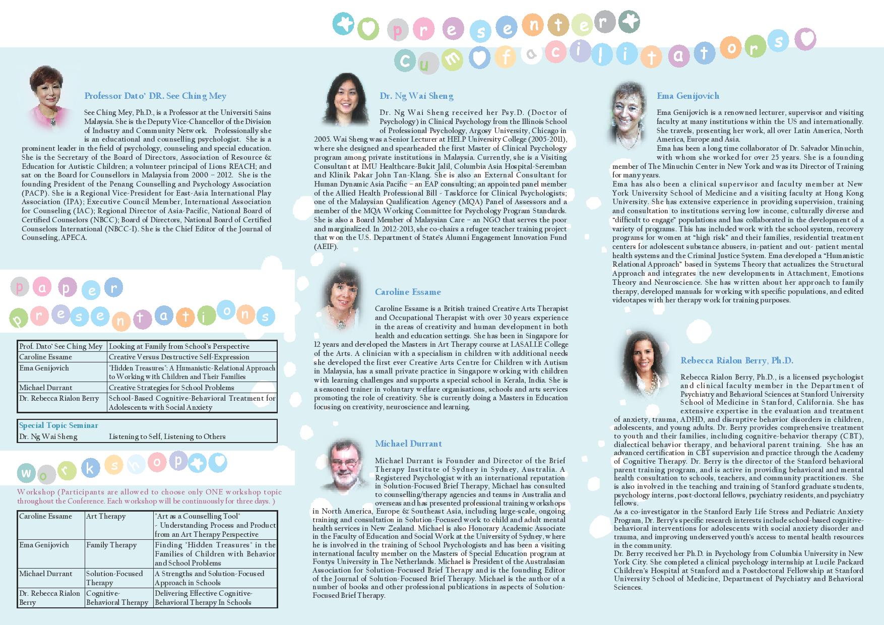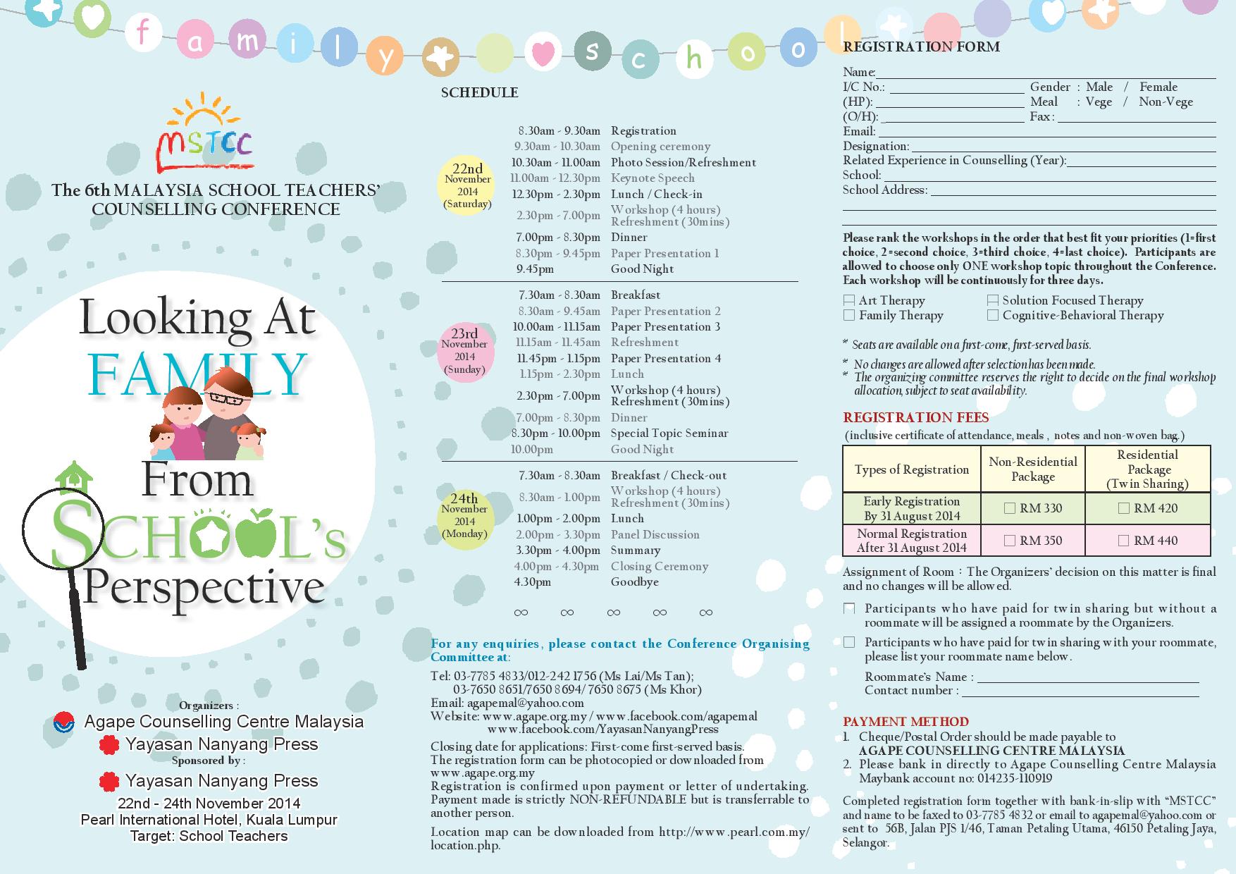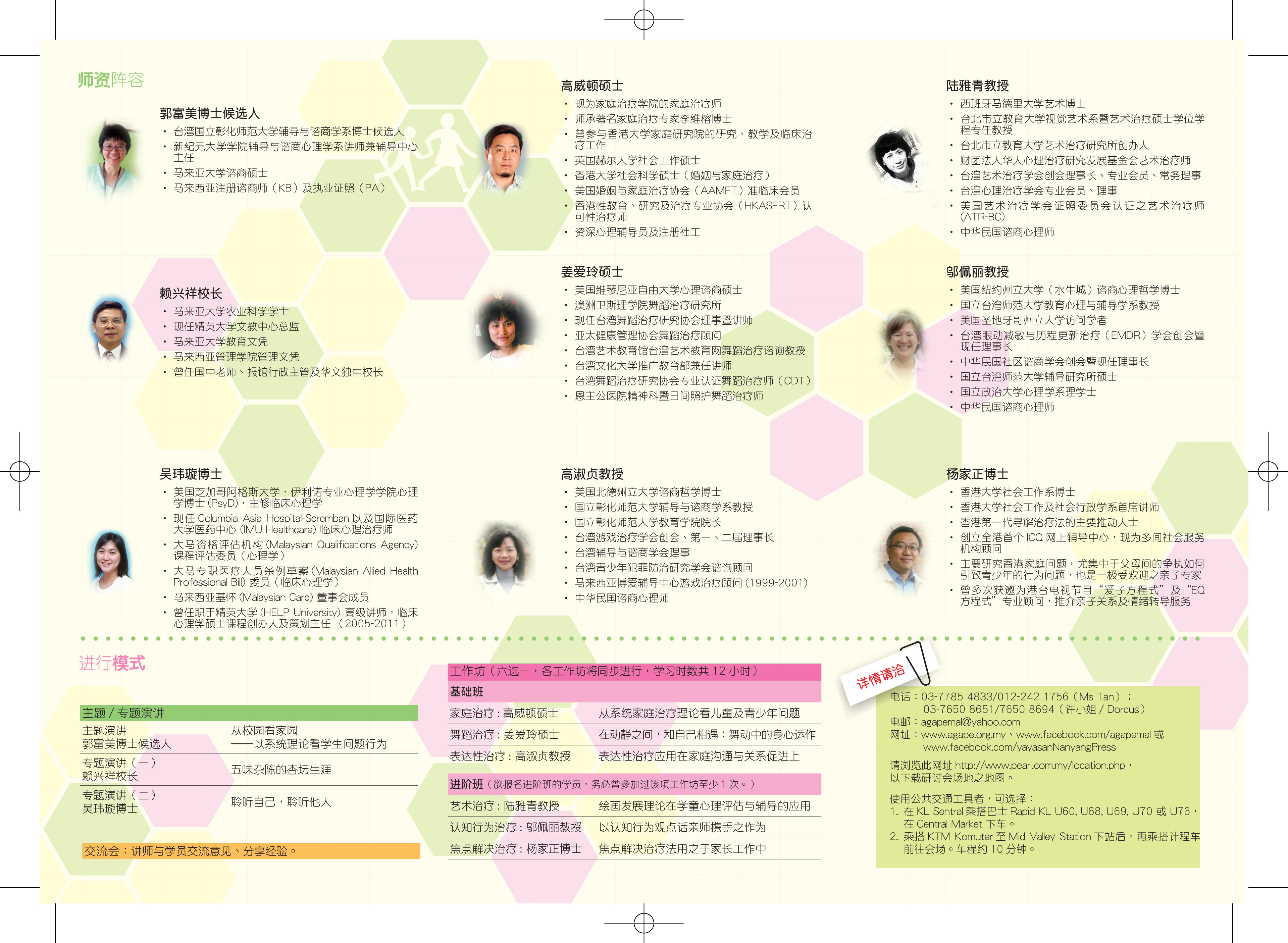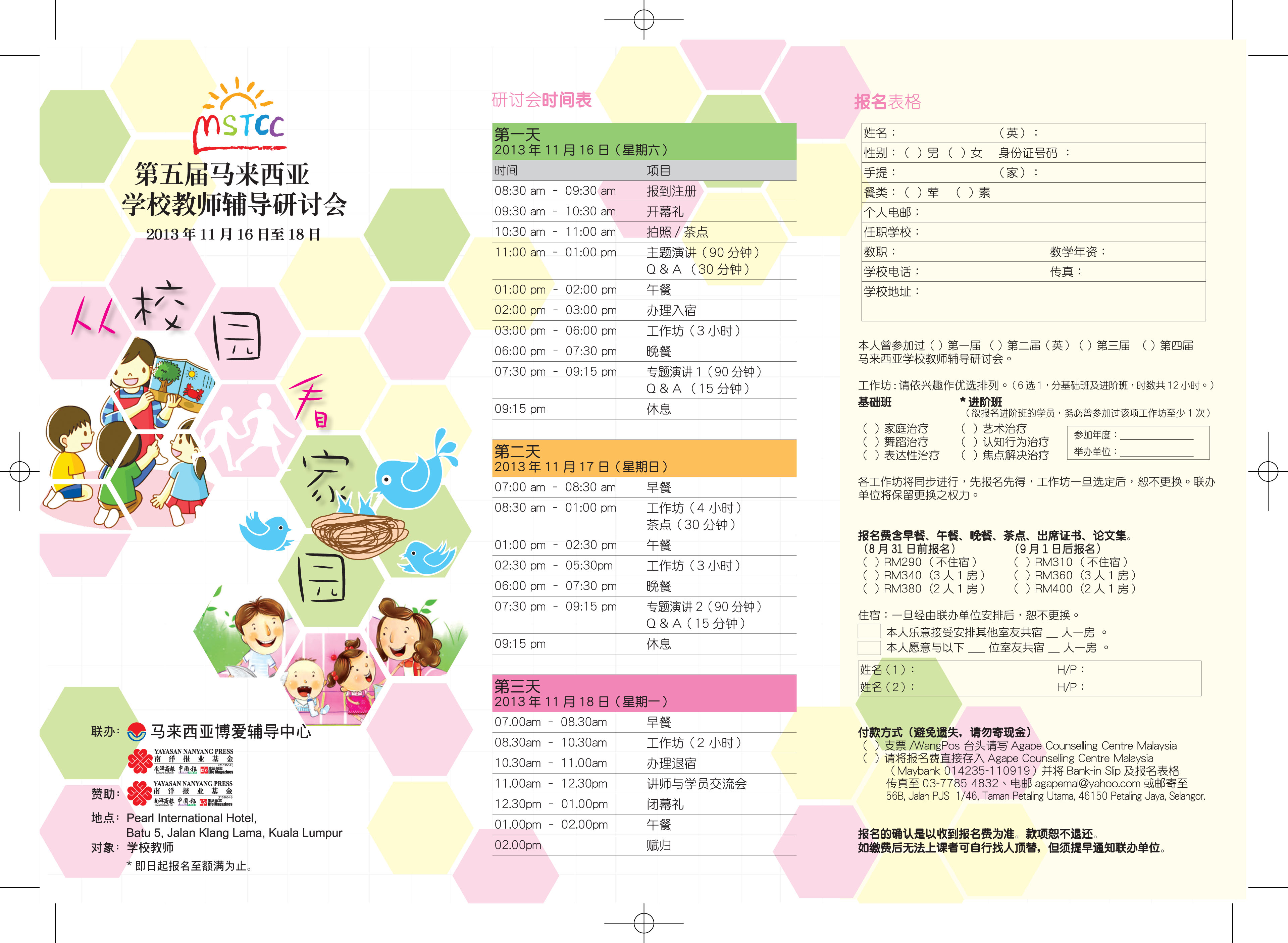 本届的大马教师辅导研讨会的主题是“校园危机:契机与转化“。研讨会的进行模式有主题及论文发表、五项工作坊: 艺术治疗, 舞蹈治疗,认知行为治疗, 表达性治疗和焦点解决治疗。艺术治疗的内容包括涂鸦、转化和成长;舞蹈治疗包括青春舞曲和身心整合;表达性治疗则是在教师心理健康照护的作用;认知行为治疗是学习校园的危机处理;最后一个是,怎么活用焦点解决治疗在校园的辅导中。每项工作坊的学习时间共12 小时,希望通过这个研讨会可以帮助更多学校教师,提升自己的辅导技巧。 最近报章上频频出现有关学生自杀的新闻, 引起许多人的关注和讨论。这些学生选择不归路的原因有如:考试成绩不理想、经不起失恋的挫败、家庭压力等等,孩子们的心灵很脆弱,所以面对难题的时候就不堪一击。因此,现在的教师也开始担起辅导的责任,尝试了解学生的问题,并以适当的治疗方法开导他们。然而,老师和学生的打架事件也逐日上升,这些暴力行为严重损坏学校的形象,也粉碎社会对校方的信任,重新评估现今的教学方案。这一届主题“校园危机:契机与转化“,宗旨就是希望教师可以学习到更有效的辅导方法,运用在自己和学生之间的关系上,把学校的危机转化成契机。所谓契机,能够造就奇迹。 这一次研讨会的讲师阵容非常强大,邀请到国内外著名的辅导专家,包括了中国湖北省武汉华中师范大学教育科学学院教育学的蔡苔芬博士,马来西亚国民大学辅导学的李志祥博士,西班牙马德里大学艺术博士的陆雅青教授,美国纽约州立大学谘商心理哲学博士的邬佩丽教授,台湾辅仁大学谘商心理学博士的李宗芹副教授,美国北德州立大学谘商哲学博士的高淑贞教授,香港大学社会工作博士的杨家正博士。 辅导是一门宝贵的学问, 所以南洋报业基金愿意捐助十万零吉给每一届辅导研讨会,而且今年的捐赠更增至到十五万零吉,成就更多教师学习的机会。博爱辅导中心和南洋报业基金,都希望通过这个研讨会可以让学员们受惠受益,把学到的知识发挥在学校里,提升一个健康的社会。 Events 活动7th Malaysia School Teachers Counselling Conference 第七届马来西亚学校教师辅导研讨会, 21-23 November 2015Links: Introduction 简介 | Workshop Schedule 研讨会时间表 | Speakers Introduction 讲师简介 | Registration 报名表格 The 1st Conference on Counselling for Malaysian Caregivers 《第一届马来西亚助人工作者辅导研讨会》, 30 May – 1 June 2015Links: Introduction 简介 | Teachers 老师 | Registration Form 报名表格 1 | Registration Form 报名表格 2 6th Malaysia School Teachers’ Counselling Conference 第六届马来西亚学校教师辅导研讨会, 22-24 November 2014Links: Introduction 简介 | Workshop Schedule 研讨会时间表 | Introduction of Speakers 讲师简介 10th Malaysia Chinese’ Counselling Conference 第十届马来西亚华社辅导研讨会, 23-25 October 2014Links: Introduction 简介 | Registration Form Page 1 报名表格 1 | Registration Form Page 2 报名表格 2 Basic Games Therapy Workshop 《游戏治疗初阶训练》工作坊, 7-8 December 2013Links: Introduction 简介 | Registration Form 报名表格 5th Conference on Counselling for School Teachers of Malaysia 第五届马来西亚学校教师辅导研讨会, 16-18 November 2013Links: Introduction 简介 | Teachers | Poster | Registration Form page 1 | Registration Form page 2 A Talk on Autism: Understanding Autism and Its Treatment 自闭症醒觉讲座会: 了解自闭症及其治疗方式, 14 April 2013Links: Introduction | Registration Form | Poster | News 新闻 #1 | News 新闻 #2 第四届马来西亚学校教师辅导研讨会 – 4th Conference on Counselling for School Teachers of Malaysia, 10-12 November 2012Links: News | Newspaper Cutting | Brochure 1 | Brochure 2 | Registration Form